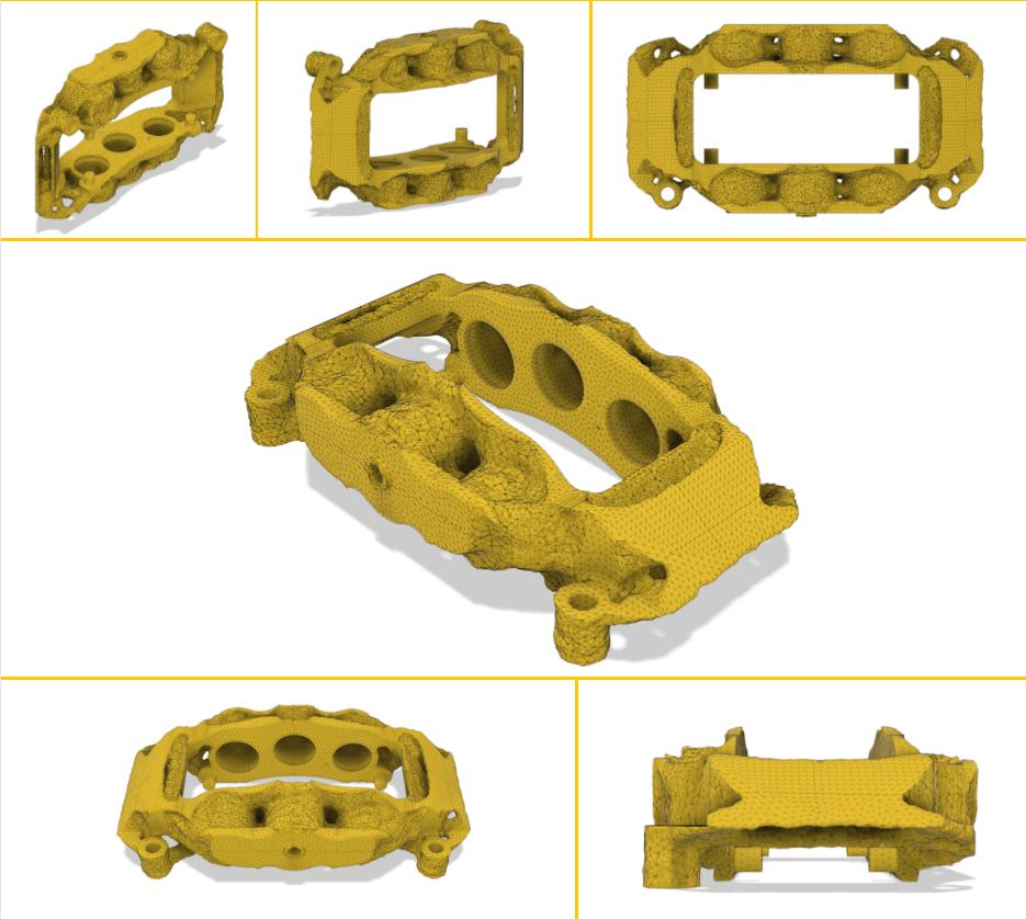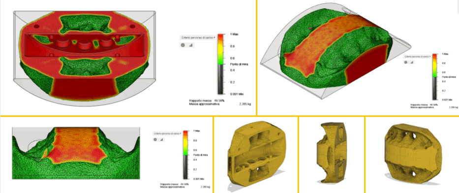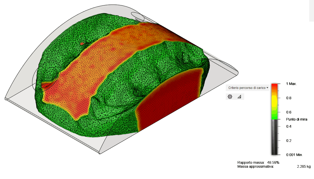 Ottimizzazione topologica e la simulazione dei carichi e dei vincoli applicati sulla pinza freno, eseguite su Midas NFX e Fusion 360.